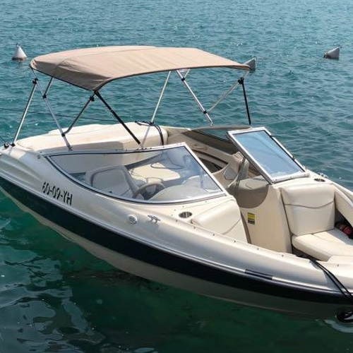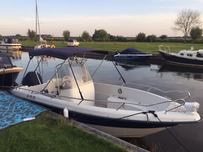 Deze speedboot heeft een Navishade biminitop 3 boogs met hoogte op 91 cm. Deze is op het raam gemonteerd. Tip de ramen moeten wel vlak zijn, als de randen rond lopen kun je beter deksteunen met holle onderkant er los bij bestellen. Er is hier gekozen voor de prachtige kleur taupe