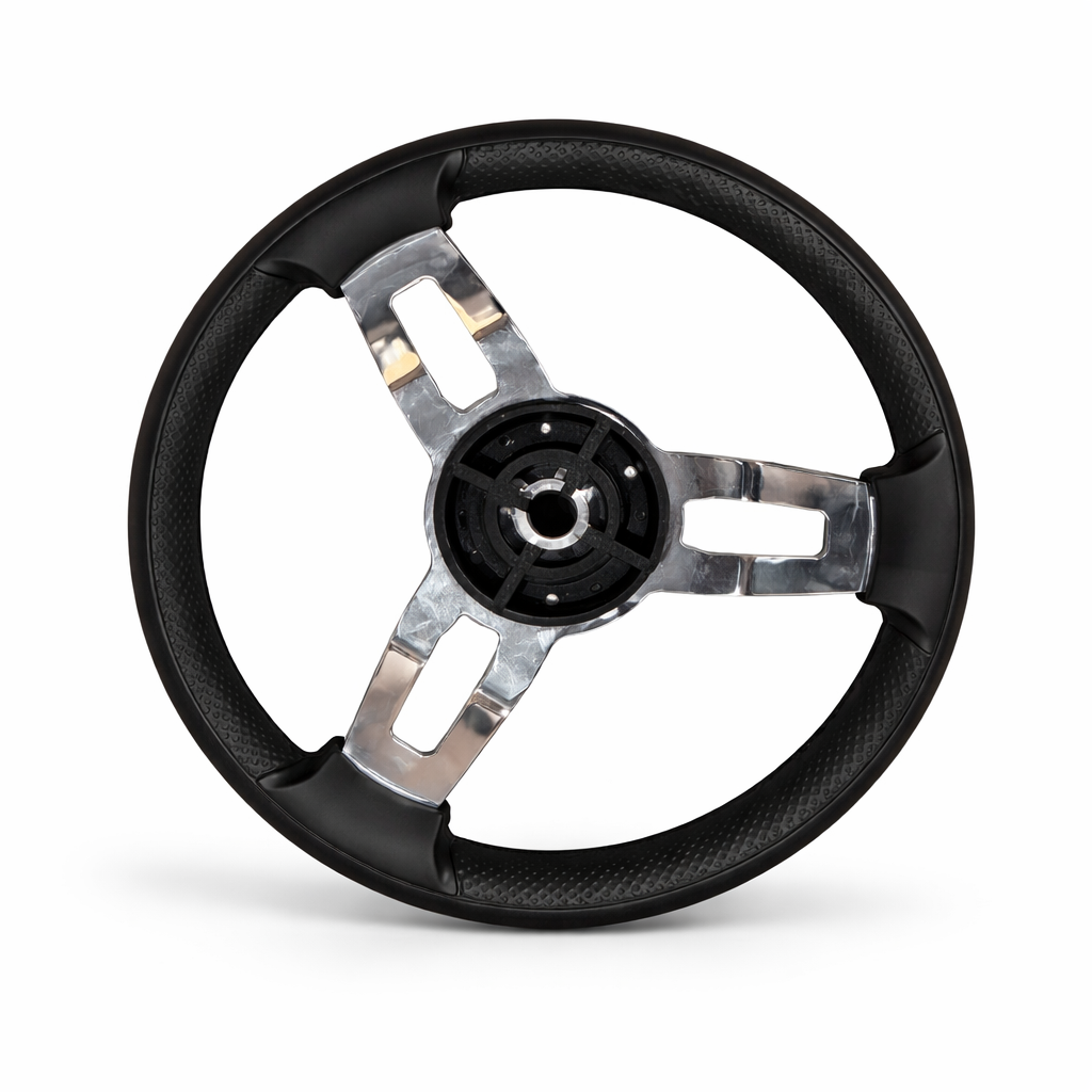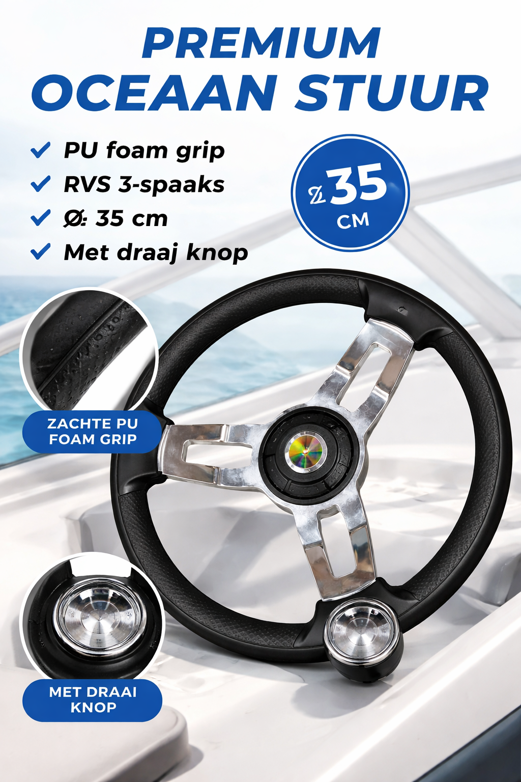 Boot stuur zwart Ø35 cm – PU foam grip met RVS 3-spaaks design en draaiknop